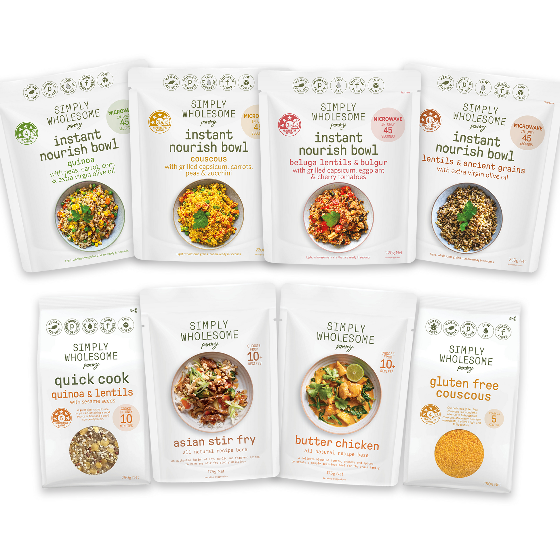 1 x Nourish Bowl - Quinoa & Peas 1 x Nourish Bowl - Couscous & Veg 1 x Nourish Bowl - Beluga Lentils & Bulgur 1 x Nourish Bowl - Lentils & Ancient Grains 1 x Quick Cook Grains - Quinoa & Lentils 1 x Quick Cook Grains - Gluten Free Couscous 1 x Meal Base - Butter Chicken 1 x Meal Base - Asian Stir Fry